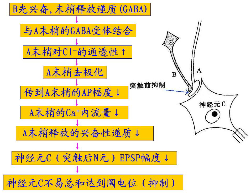 2.突触前抑制 突触前抑制发生在轴突-轴突式突触。轴突B与轴突A形成轴突—轴突式突触,不直接与神经元C的胞体相接触。正常情况下轴突末梢A兴奋可使神经元C产生兴奋性突触后电位。轴突末梢B单独兴奋时,对神经元C的活动无影响。如果轴突B兴奋一定时间后再使轴突A兴奋,则见到神经元C的兴奋性突触后电位明显减小。由此说明神经元C的兴奋活动受到了抑制。因为这种突触后神经元的抑制过程是由于改变了突触前膜的活动而引起的,因此称为突触前抑制。其发生机制是轴突B兴奋时释放的抑制性递质使轴突A突触前末梢部分去极化,跨膜电位降低。当轴突末梢A再兴奋时,产生的动作电位辐度变小,其末梢释放的兴奋性递质减少,结果使神经元C的兴奋性突触后电位减小或不能产生。突触前抑制的特征是潜伏期较长,持续时间长。突触前抑制的生理学意义可能是控制从外周传入中枢的感觉信息,对感觉传入的调节具有重要的作用。