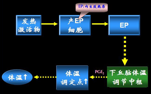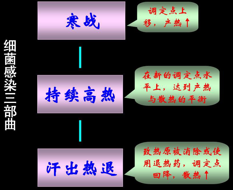 此学说认为, 由细菌所致的发热, 是由于在致热原的作用下PO/AH热敏神经元的温度反应阈值升高, 而冷敏神经元的阈值则下降, 调定点因而上移。因此, 发热开始前先出现恶寒战栗等产热反应, 直到体温升高到39℃以上时才出现散热反应。只要致热因素不消除, 产热和散热过程就继续在此新的体温水平上保持平衡。这就是说, 发热时体温调节功能并无障碍, 而只是由于调定点上移, 体温才升高到发热的水平的。