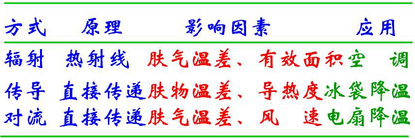 ③对流散热:对流散热(them1a1 convection)是指通过气体来交换热量的一种散热方式。人体周围总是围绕着一薄层同皮肤接触的空气, 人体的热量传给这一层空气, 由于空气不断流动便将体热散发到空间。对流是传导散热的一种特殊形式。