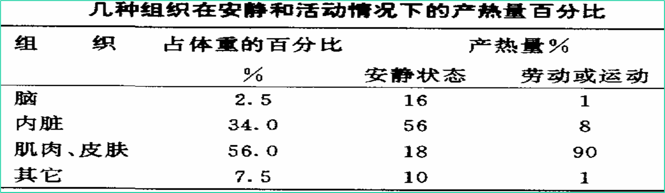 主要产热器官体内的热量是由三大营养物质在各组织器宫中进行分解代谢时产生的。但从影响整体体温的角度看, 人体主要的产热器官是肝和骨骼肌。肝是人体内代谢最旺盛的器官, 产热量最大。安静时, 肝血液的温度比主动脉的高0.4~0.8℃。虽然在安静状态下每块骨骼肌的产热量并不很大, 但由于骨骼肌的总重量占全身体重的40%左右, 因而具有巨大的产热潜力。骨骼肌的紧张度稍有增强, 产热量即可发生明显的改变, 在剧烈运动时, 产热量可增加40倍之多。