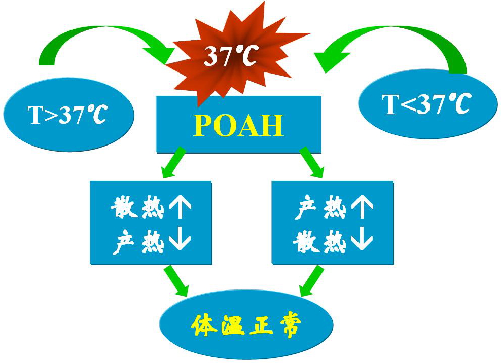 体温调定点学说认为, 体温的调节类似于恒温器的调节, 在PO/AH设定了一个调定点, 即规定的温度值, 如37℃。P0/AH体温整合中枢就是按照这个温度来调节体温的。