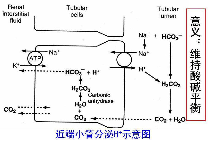 ①在近端小管上皮细胞内H+的分泌是通过Na+-H+交换进行的。