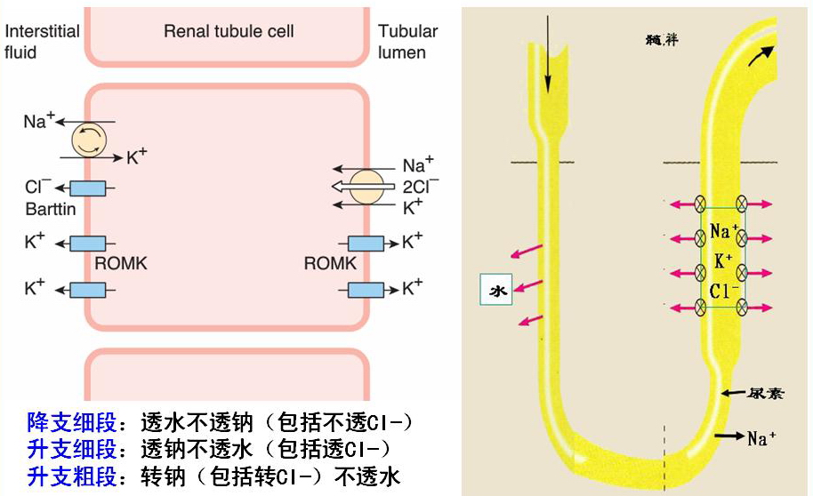 ③髓袢升支细段和粗段:NaCl的重吸收与尿的浓缩、稀释密切相关。小管液流经髓袢升支细段时由于管腔内NaCl浓度很高,管壁对Na+有通透性,Na+顺梯度扩散至髓部组织间液,Clˉ随之被动扩散.这样小管内NaCl浓度逐渐降低,而内髓组织液NaCl浓度随着小管的上升而不断升高,形成渗透梯度。