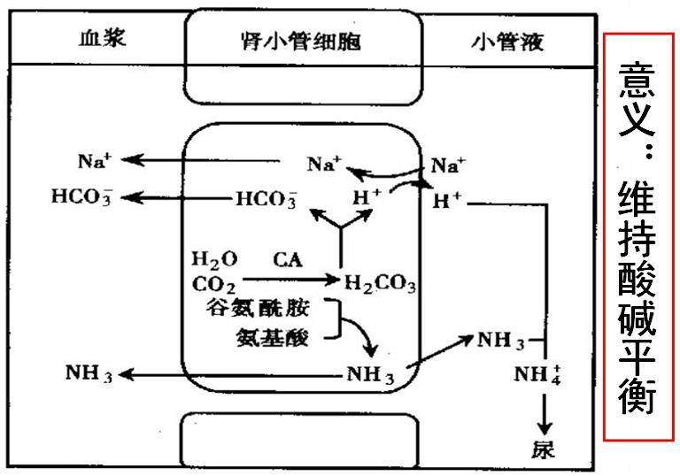 NH3主要由谷氨酰胺脱氨基生成,NH+是脂溶性物质,容易通过细胞膜扩散,其扩散方向朝着pH值低的一侧进行,H+的分泌降低了小管液pH值,NH3向小管腔中扩散,并在小管内与H+结合生成NH4+。Na+-H+交换加强,促进NaHCO3的重吸收。因此,肾小管上皮细胞NH3的分泌,不仅铵盐的生成促进排酸,而且还可维持血浆中NaHCO3浓度。