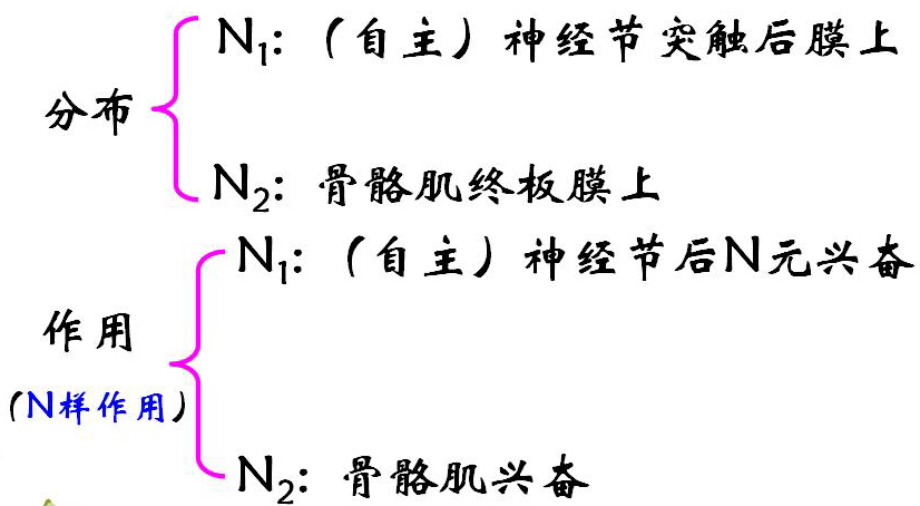②N型受体,存在于交感和副交感神经节神经元的突触后膜或终板膜上,与乙酰胆碱结合后,产生兴奋性突触后电位或终板电位,导致节后神经元或骨骼肌兴奋。这类受体还能与菸硷结合,产生相似的效应,故又称为菸硷型受体,与乙酰胆碱结合所产生的效应称为菸硷样作用(N样作用)。N型受体分为N1和N2两种亚型。N1受体分布于神经节神经元突触后膜, N2受体分布于骨骼肌终板膜上。