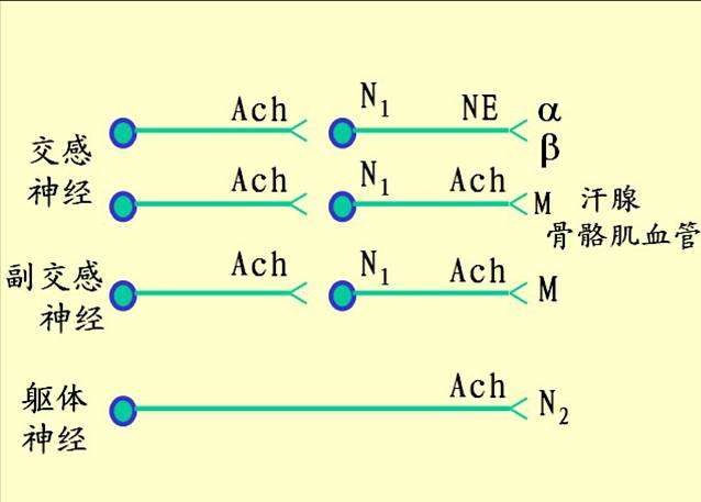 2.儿茶酚胺及其受体 在外周神经系统中,除支配汗腺的交感神经和骨骼肌的交感舒血管纤维属于胆硷能纤维外,其他的多数交感神经节后纤维释放递质为去甲肾上腺素。这种释放去甲肾上腺素作为递质的纤维称为肾上腺素能纤维。