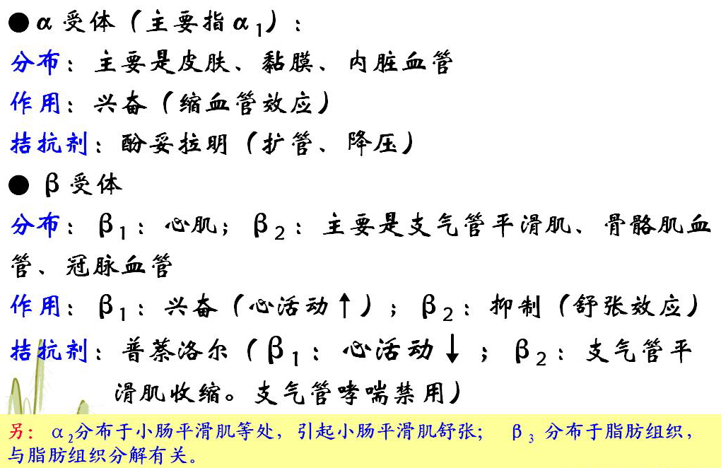 能与肾上腺素和去甲肾上腺素结合的受体称为肾上腺素能受体。多数的交感神经节后纤维释放的递质是去甲肾上腺素,它对效应器的作用可为兴奋性的或抑制性的,取决于效应细胞上肾上腺素能受体的类型。该类受体有两类:①α型肾上腺素能受体(简称α受体)。去甲肾上腺素或肾上腺素与之结合后主要引起血管收缩、子宫收缩和扩瞳肌收缩,可被酚妥拉明阻断。但也有抑制作用,如引起小肠舒张。α受体分为α1和α2两个亚型。②β型肾上腺素能受体(简称β受体)。去甲肾上腺素或肾上腺素与之结合后引起平滑肌抑制、血管舒张、小肠舒张和支气管扩张等。β受体分为β1、β2和β3三个亚型。心肌细胞上存在α1和β1受体,均可引起心肌兴奋,但β1受体的作用较明显。去甲肾上腺素对α受体的作用强,对β受体作用弱;肾上腺素对β受体的作用强于去甲肾上腺素;异丙肾上腺素主要对β受体起作用。不同效应器肾上腺素能受体的分布及其效应详见第五版教材的表10-5。目前β受体阻断剂的研究进展很快,并已广泛用于临床。普萘洛尔可阻断β1、β2和β3三种受体,用药后会引起支气管痉挛。心得乐对气管平滑肌的β2受体阻断作用很强,而对心肌β1受体阻断作用较小。心得宁主要阻断β1受体,对支气管平滑肌的β2受体阻断作用很小,用于呼吸系统疾病患者的治疗,可避免发生支气管痉挛。