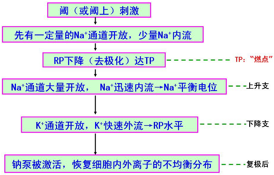 Na+通道失活的迅速出现,可以解释神经或肌细胞的动作电位达到超射值的顶点后何以不能维持在这一数值,而是迅速下降,表现为锋电位的形式。因为这时大多数被激活的Na+通道已进入失活状态而不再开放。这也决定了神经和肌组织在接受剌激而兴奋,亦即正当出现锋电位的时期内,不可能再接受任何新的刺激而出现新的锋电位,因而也不可能发生两次锋电位的叠加。这一时期称为绝对不应期(absolute refractory period)。绝对不应期之后,还接着有一个相对不应期(relative refractory period)发生,标志着一些失活的Na+通道已开始恢复,这时只有一些较正常时更强的剌激才能引起新的兴奋。