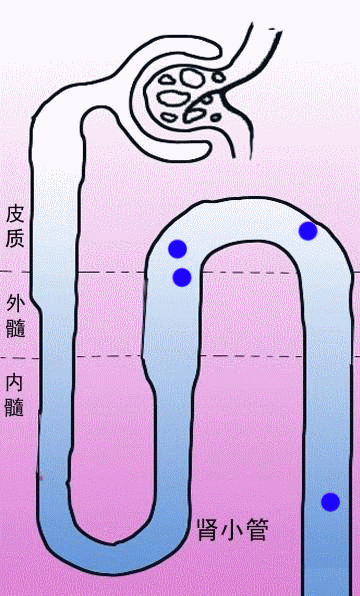 ②NaCL对渗透梯度形成的作用:在髓袢降支细段对NaCl不易通透,但对水有通透性, 降支细段小管液NaCl浓度愈来愈高,到髓袢顶端转折处达最高值。小管液转入升支细段后,管壁对NaCl有较高通透性,对水则不易通透,NaCl便顺浓度梯度扩散入内髓部组织液,提高内髓部渗透梯度。