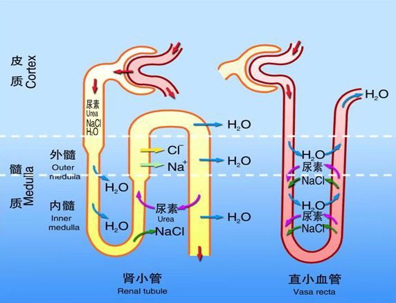 总之, 髓质高渗梯度是依赖于髓袢的逆流倍增作用建立的,尿素的再循环增强了髓质高渗梯度,而髓质高渗梯度的维持还有赖于直小血管的逆流交换作用。