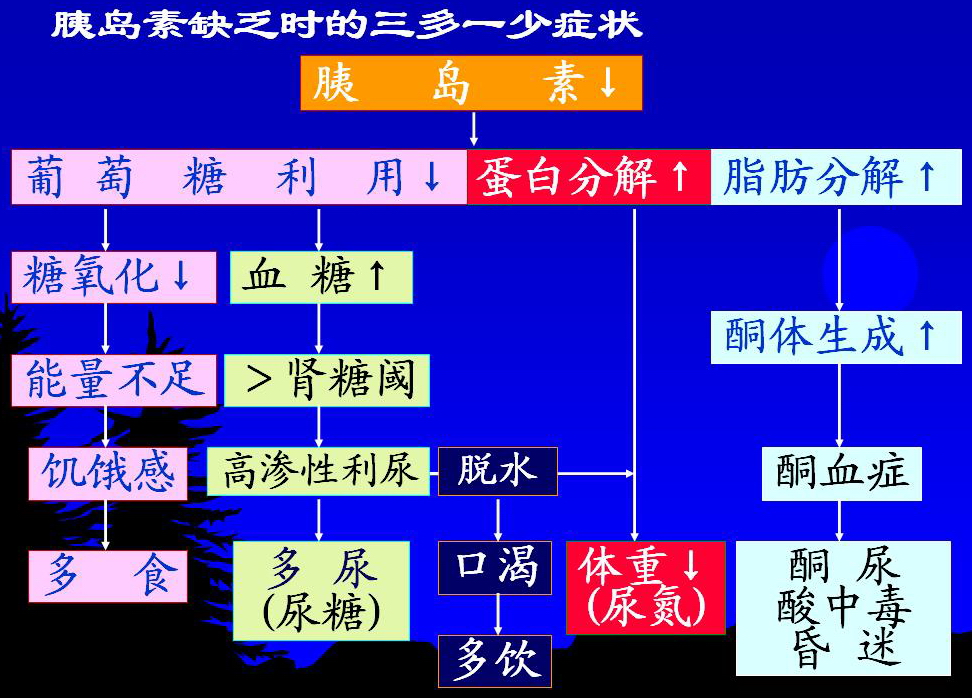 ②对脂肪代谢胰岛素促进脂肪的合成与贮存,并抑制脂肪分解氧化。胰岛素不足,将引起脂肪代谢紊乱,脂肪贮存减少,分解增强,血 脂升高,易造成心、脑血管疾病。又因脂肪酸在肝内分解氧化增多,产 生大量酮体而导致酮血症、酸中毒。