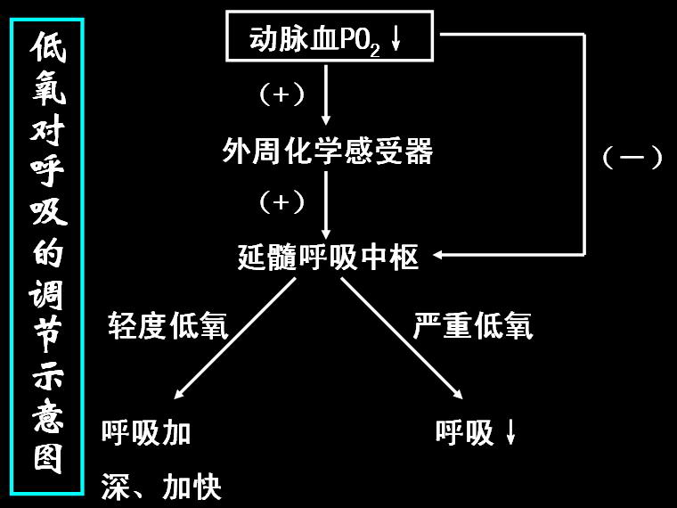 低氧对呼吸的影响:动脉血O2分压的下降导致强烈的呼吸兴奋。这一效应完全是通过刺激外周化学感受器所致。动脉血O2分压的降低对呼吸中枢本身的直接作用是抑制。严重缺氧时,当外周化学感受器的传入兴奋不足以克服低氧的直接抑制作用,终将导致呼吸抑制。