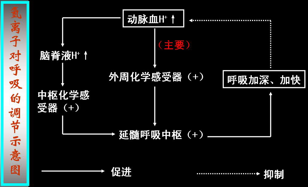 H+对呼吸的影响:动脉血H+浓度升高导致呼吸加深加快,降低则导致呼吸抑制。H+是通过刺激外周化学感受器和中枢化学感受器兴奋呼吸。尽管中枢化学感受器对H+的敏感性远高于外周化学感受器,但血液中的H+难以通过血-脑脊液屏障和血-脑屏障,因此外周化学感受器在H+浓度升高导致的呼吸反应中起主要作用。