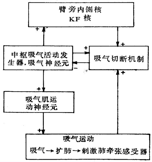 脑桥呼吸神经元群(PRG):位于脑桥嘴段背外侧的臂旁内侧核(NPBM)和KF核(Kölliker-Fuse核)。其中臂旁内侧核中存在呼气神经元和跨时相神经元,KF核中存在吸气神经元。