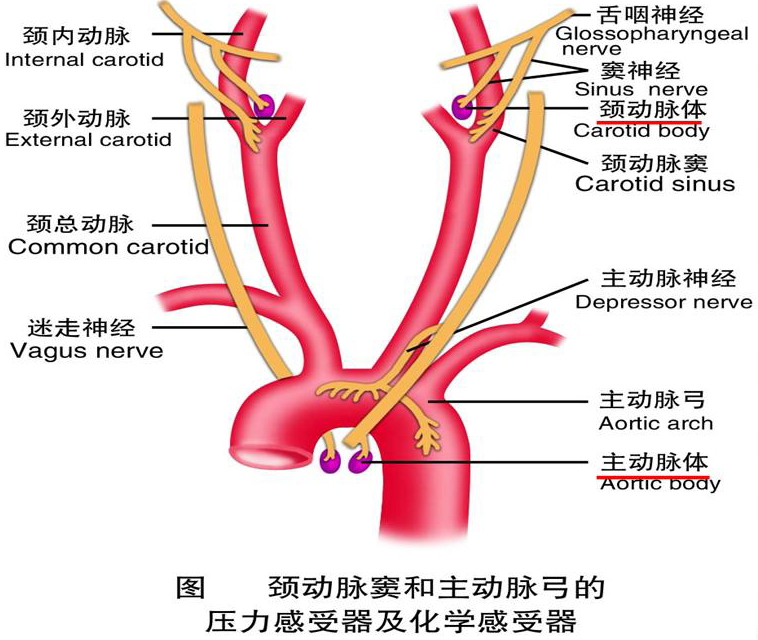 外周化学感受器(peripheralchemoreceptor)存在于颈动脉体和主动脉体,前者主要参与呼吸调节,后者则在循环调节方面较为重要。颈动脉体内含有I型球细胞和II型鞘细胞,I型细胞直接或间接与神经末梢形成突触联系,被认为是化学感受细胞。外周化学感受器对血O2分压和H+高度敏感。