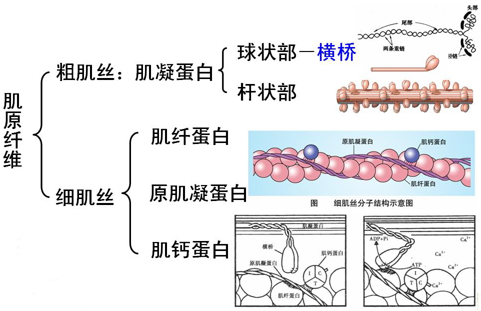 肌小节的明带和暗带包含有更细的、纵向平行排列的丝状结构,称为肌丝。暗带中含有的肌丝较粗,直径约10nm,称为粗肌丝,其长度与暗带相同。明带中的肌丝较细,直径约5nm,称为细肌丝;它们由Z线结构向两侧明带伸出,每侧的长度都是1.0μm,它的游离端在肌小节总长度小于3.5μm的情况下,必然有一段要伸入暗带,和粗肌丝处于交错和重叠的状态;如果由两侧Z线伸入暗带的细肌丝未能相遇而隔有一段距离,这就形成了较透明的H带。