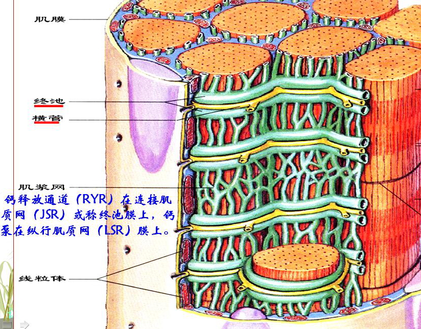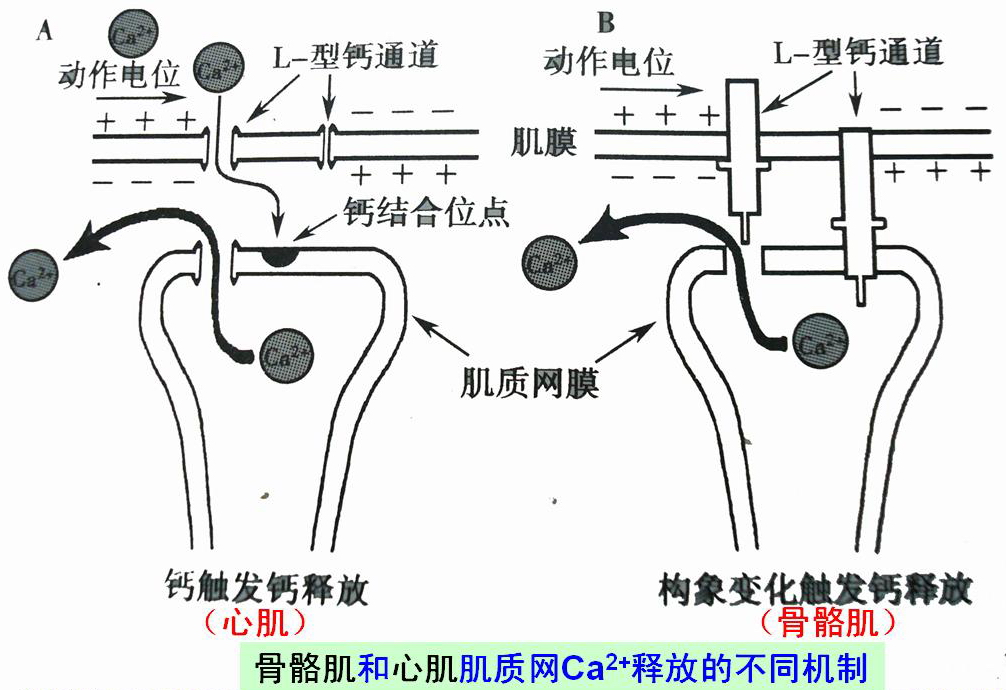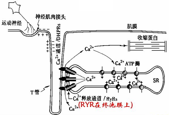 肌肉安静时肌浆中的Ca2+浓度低于10-7mol/L,但在膜开始去极化后1~5ms内升高到10-5mo1/L的水平,亦即增高100倍之多。当肌膜上的电变化沿横管系统到达三联管部分时,一定有某种因子把横管膜上发生的变化传递给了相距不远的肌浆网膜上的类似Ca2+通道的结构,引起后者分子变构,使通道开放,于是肌浆网内高浓度的Ca2+就不需耗能而靠易化扩散进入肌浆,到达肌丝区。对于三联管处的这一信号转导过程,目前已有一些了解。据研究,横管膜上有一种类型的钙通道,它在胞浆侧的肽链结构正好和终未池膜(即肌浆网膜的延续部分)上另一种钙通道在胞浆侧的肽链部分两两相对。在骨骼肌,前者可能对后者的通道开口起着堵塞作用,只有当到达横管膜上的电信号引起该膜中的钙通道出现变构时,才会使堵塞消除而使终末池中的Ca2+大量进入胞浆,引起肌丝滑行。