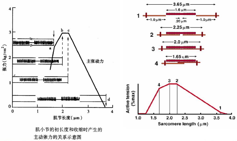 肌肉产生张力或缩短,靠的是粗肌丝表面的横桥和细肌丝之间的相互作用。肌肉的初长度决定每个肌小节的长度,因而也决定细肌丝和粗肌丝相重合的程度,而这又决定了肌肉收缩时有多少横桥可以与附近的细肌丝相互作用。从理论上分析,粗肌丝的长度是1.5μm,但由于在M线两侧各0.1μm的范围内没有横桥,因此在M线两侧有横桥的粗肌丝长度各为0.65μm,这样当每侧细肌丝伸入暗带0.65μm (尚位于明带的细肌丝长度为0.35μm),亦即肌小节总长度为2.2μm 时,粗肌丝上的每个横桥都有与细肌丝相互作用的条件,因而收缩时应当出现最佳的效果。实验观察证明正是如此,因为当肌肉处于最适前负荷或初长度时,它的每个肌小节的长度正是2.2μm。无论减少前负荷使肌小节长度小于2.2μm或增加前负荷大于最适前负荷使肌小节的长度将大于2.2μm,都使得肌肉收缩时起作用的横桥数减少,造成所产生张力的下降。当前负荷使肌小节长度增加到3.5μm时,细肌丝将全部由暗带拉出,这时肌肉受刺激时不再能产生主动张力。