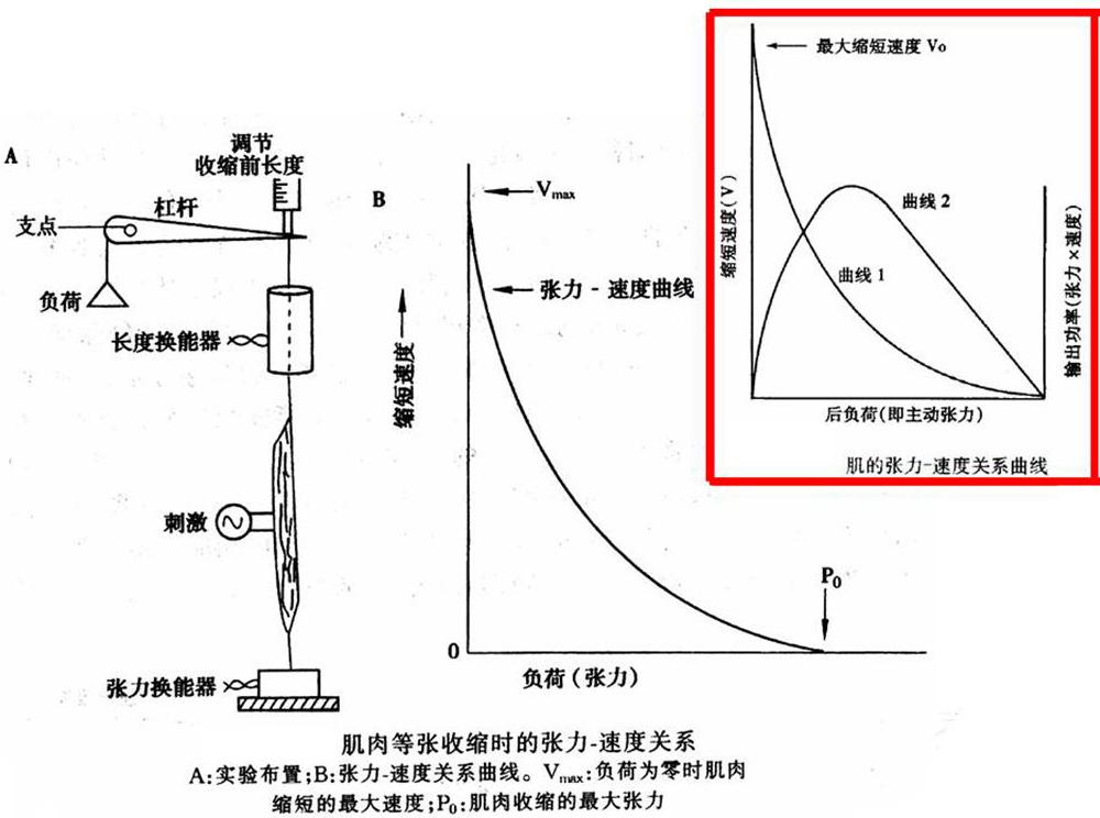 在曲线同纵坐标和横坐标相交的之间,在不同的后负荷时都能看到肌肉在产生与负荷相同的张力的情况下将负荷移动一定的距离,这种类型的收缩称为等张收缩(isotonic contraction),都可作功并有功率输出;当后负荷相当于最大张力的30%左右时,肌肉的输出功率最大。