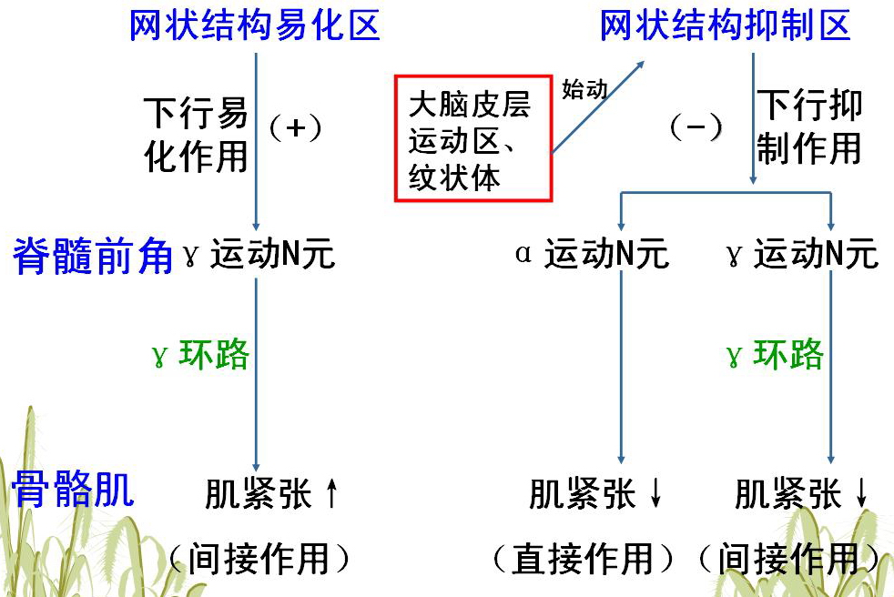 正常情况下易化区的活动较强,抑制区活动较弱。因此,易化区的活动占优势,两个区的功能相互拮抗而又维持相对平衡,从而形成了适宜的肌紧张。一旦两者的平衡破坏,则出现肌紧张亢强或减弱。