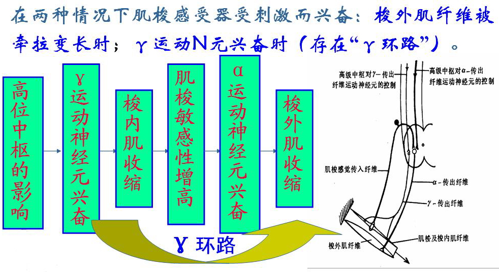 加强肌紧张的机制有二种。一种是高位中枢下行作用,直接或间接地兴奋脊髓α运动神经元,导致肌紧张加强,而出现僵直,称为α僵直;另一种是高位中枢的下行作用,首先兴奋脊髓γ运动神经元,提高肌梭的敏感性,使其传入冲动增多,转而兴奋α运动神经元,引起肌紧张加强,出现僵直,称为γ僵直。经典的去大脑僵直属于γ僵直,因为在消除肌梭传入冲动对中枢的作用后,僵直现象便消失。