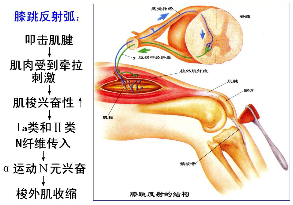 (1)腱反射:是指快速牵拉肌腱时引起的牵张反射。如膝反射、跟腱反射等。腱反射为单突触反射。反射弧比较简单,一般只涉及1~2个脊髓节段,反应范围只限于受牵拉的肌肉本身。