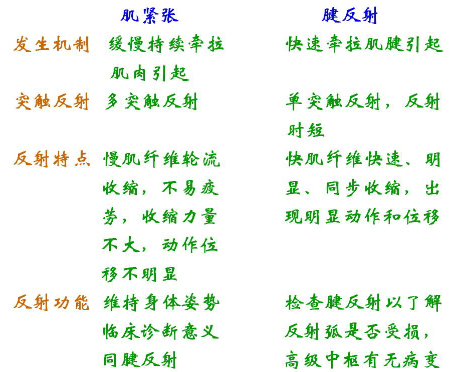 (2)肌紧张:是指缓慢持续牵拉肌腱时引起的牵张反射,表现为受牵拉的肌肉发生轻度、持续的紧张性收缩,以阻止其被牵拉。肌紧张能持久维持而不发生肌肉易疲劳,同时肌肉收缩力量不大,不引起明显的动作。肌紧张是保持身体平衡和维持姿势最基本的反射活动,是姿势反射及进行其他复杂运动的基础。肌紧张的反射弧与腱反射相似,但它在中枢可能经过多突触传递,故属于多突触反射。