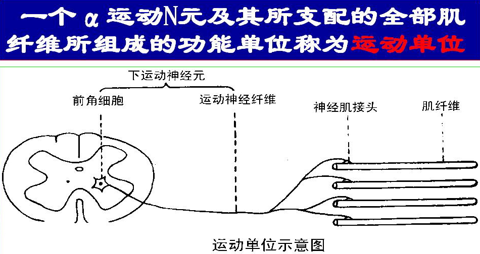 α运动神经元是骨骼肌运动反射的最后公路。由一个α运动神经元及其末梢所支配的全部肌纤维所组成的功能单位,称为运动单位。运动单位的大小不一,取决于运动神经元轴突末梢分支的数量及其所支配的肌纤维多少。运动单位的大小还与肌肉的功能特点有关。γ运动神经元的细胞体小,并散布在α运动神经元之间。γ运动神经元的兴奋性较高,并具有持续的高频电活动,具调节肌梭对牵拉刺激的敏感性的作用。