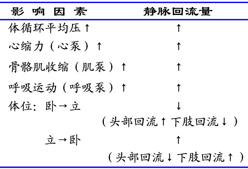 根据公式血流量=(P1-P2)/R 即,单位时间内的静脉回心血量取决于外周静脉压和中心静脉压的差,以及静脉对血流的阻力。因此,凡能影响外周静脉压、中心静脉压以及静脉阻力的因素都能影响静脉回心血量。
