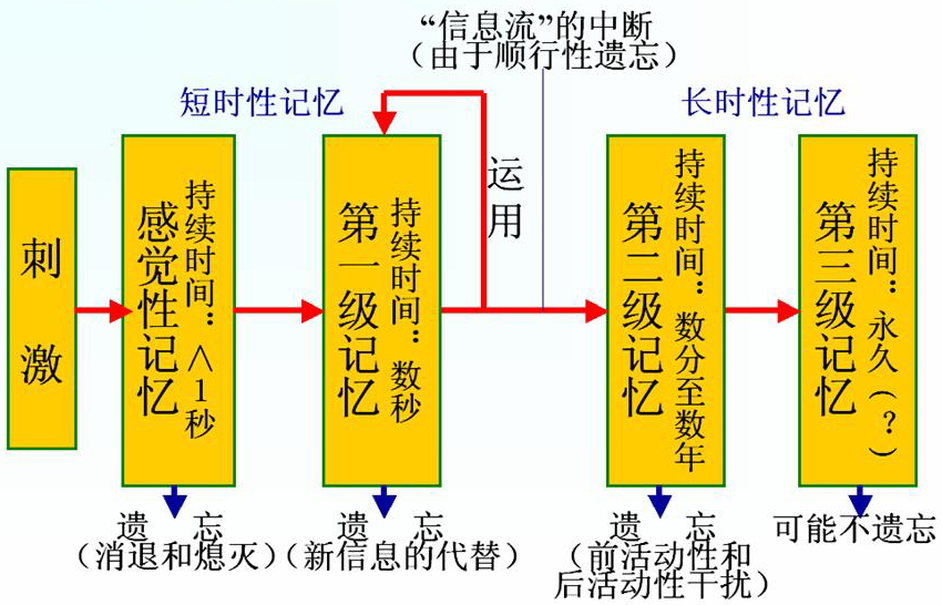 人类的记忆过程可细分为四个连续的阶段,即感觉性记忆、第一级记忆、第二级记忆和第三级记忆。前两个阶段相当于短时性记忆,后两个阶段相当于长时性记忆。感觉性记忆是指信息经感受器官进入大脑皮层感觉区短暂贮存的阶段,贮存时间不超过1秒钟。如果对信息经过加工处理,把那些不连续的先后传入的信息整合成新的连续性的印象,则由感觉性记忆转入第一级记忆。但是,信息在第一级记忆中也只是贮存短短的数秒钟。若经过反复学习和运用(复习),信息贮存的时间延长并容易从第级一记忆转入第二级记忆。第二级记忆是一个大而持久的信息贮存系统。信息可在这一阶段贮存数分钟至数年而不被忘记。有些记忆的痕迹,如自己的名字和日常性的操作手艺等,永不被遗忘,这类记忆属于第三级记忆。