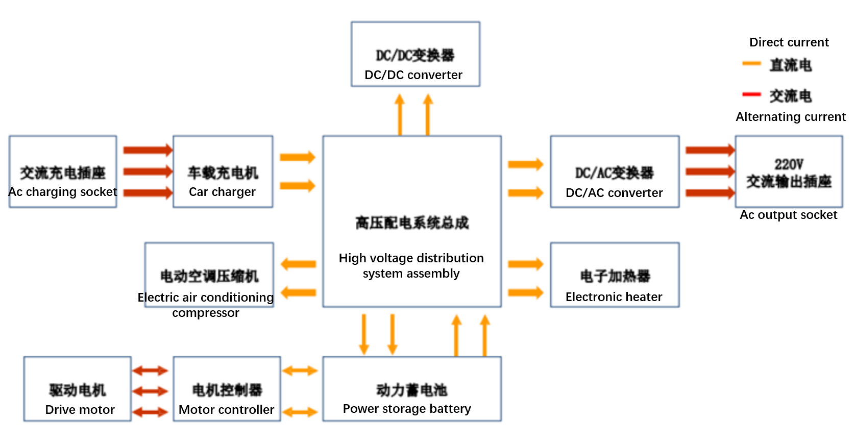 高压配电系统总成主要实现整车电能分配,并为高压零部件提供电气保护(过载保护和短路保护)。实现的功能如下:1.在BAT、OBC、DC/DC、DC/AC、AC和 PTC等高压零件之间传输、分配电能;2.具备OBC、DC/DC、AC、PTC和DC/AC过载保护和短路保护功能;3.具备PTC档位控制功能;4.具备3路高压互锁检测功能及高压配电箱箱盖开启检测功能; 5.可实现AC和PTC的绝缘故障与互锁故障隔离。