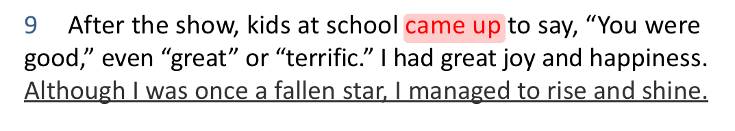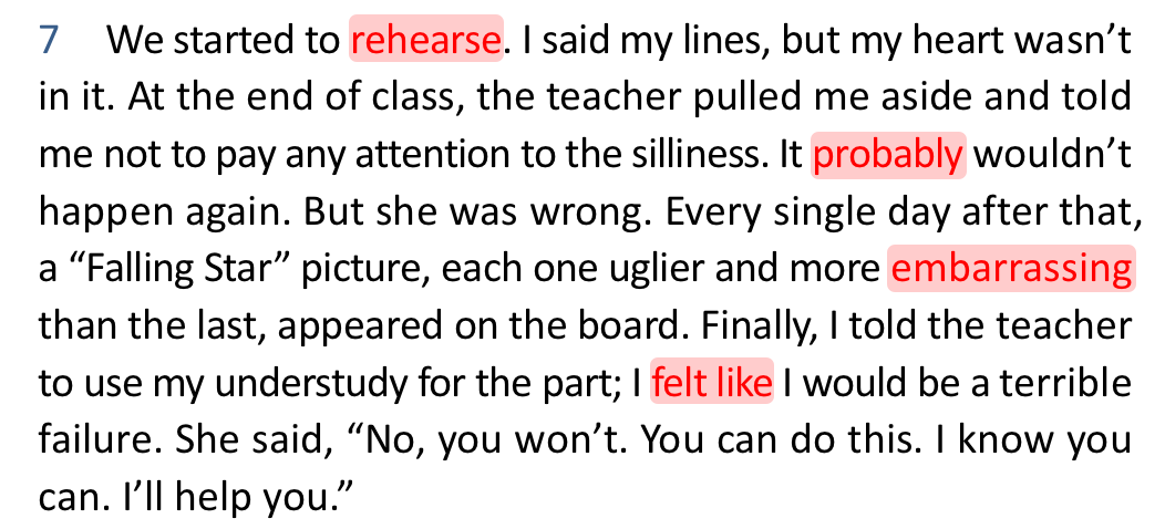 在我们开始排练,我念着台词,却总是心不在焉。下课时,老师把我叫到一边,告诉我不要理会那些愚蠢的行为,这些事情可能不会再发生了。但是她错了。从那之后的每一天,黑板上都会出现一幅“陨落之星”的画,画得一天比一天丑陋,一天比一天令人难堪。最后,我要求老师启用替补演员代替我,因为我觉得自己会一败涂地。老师却说:“你不会失败的,你能做到。我知道你能行,我会帮助你的。”