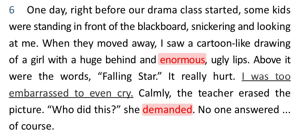 一天,在我们话剧课上课之前,几个同学站在黑板前,窃笑着看着我。当他们走开,我看见一幅像漫画一样的女孩画像,屁股硕大,嘴唇又大又丑。漫画的上面写着几个字,“陨落之星”。这真的伤了我的心。我太尴尬了,甚至都没哭。老师平静地将黑板上的漫画擦掉。“谁干的?”她问道。当然,没有人承认。