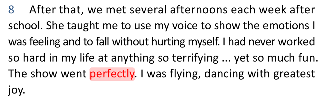 从那以后,我们每周都在下午放学后碰几次面。她教我如何使用声音表达自己当时体会到的感情,如何表演摔倒而避免自己受伤。我此生中从未那么努力地去做一件虽然令我觉得害怕却很有趣的事。演出非常完美。我带着无尽的喜悦飞扬着,舞动着。