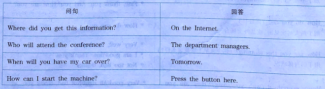 常考询问信息的句式有三种:一般疑问句、特殊疑问句,选择疑问句。询问的主题涉及到时间,地点、人物、事件等,回答应该直扣主题,提供对方需要的信息。