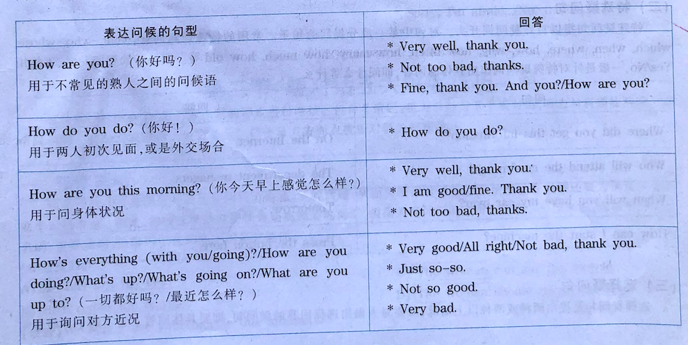 问候情景主要有以下常用句式,较为简单。平时多记住这些常用问候句式和网答句式,便能掌握这个情景,以下列举了四种常见问候语: