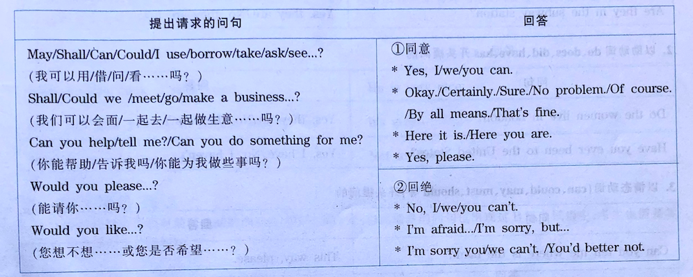 表示请求的情景是听力问答中最经常考查到的情景之一。以下总结一些考试中常出现的问句: