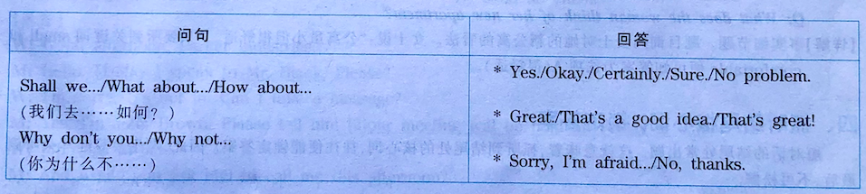 表示建议的情景相对前面总结的四点而言要比较少考,但此情景的问句也出现过B级考试当中,考生也需要掌握一些有关提出建议的问句。