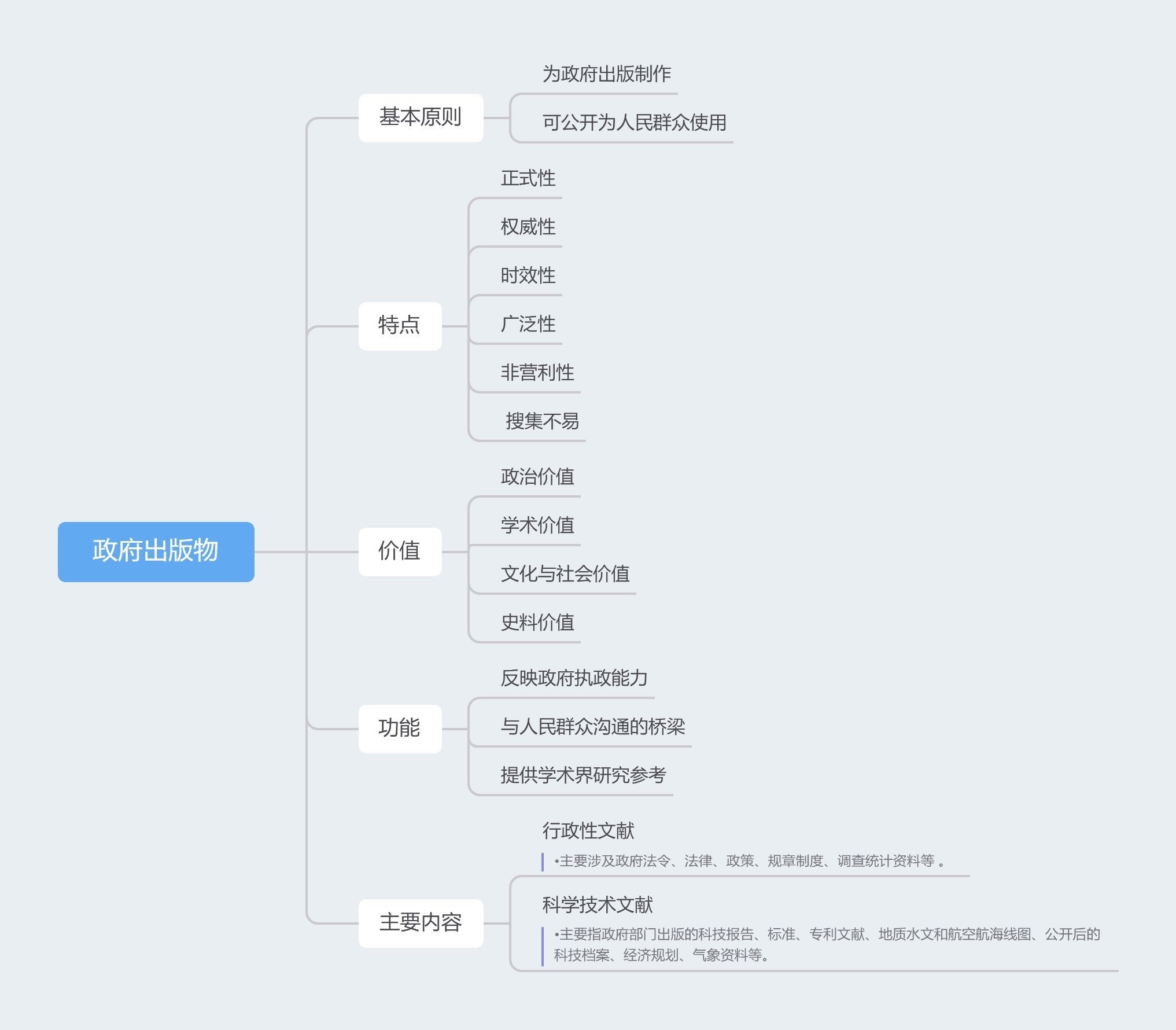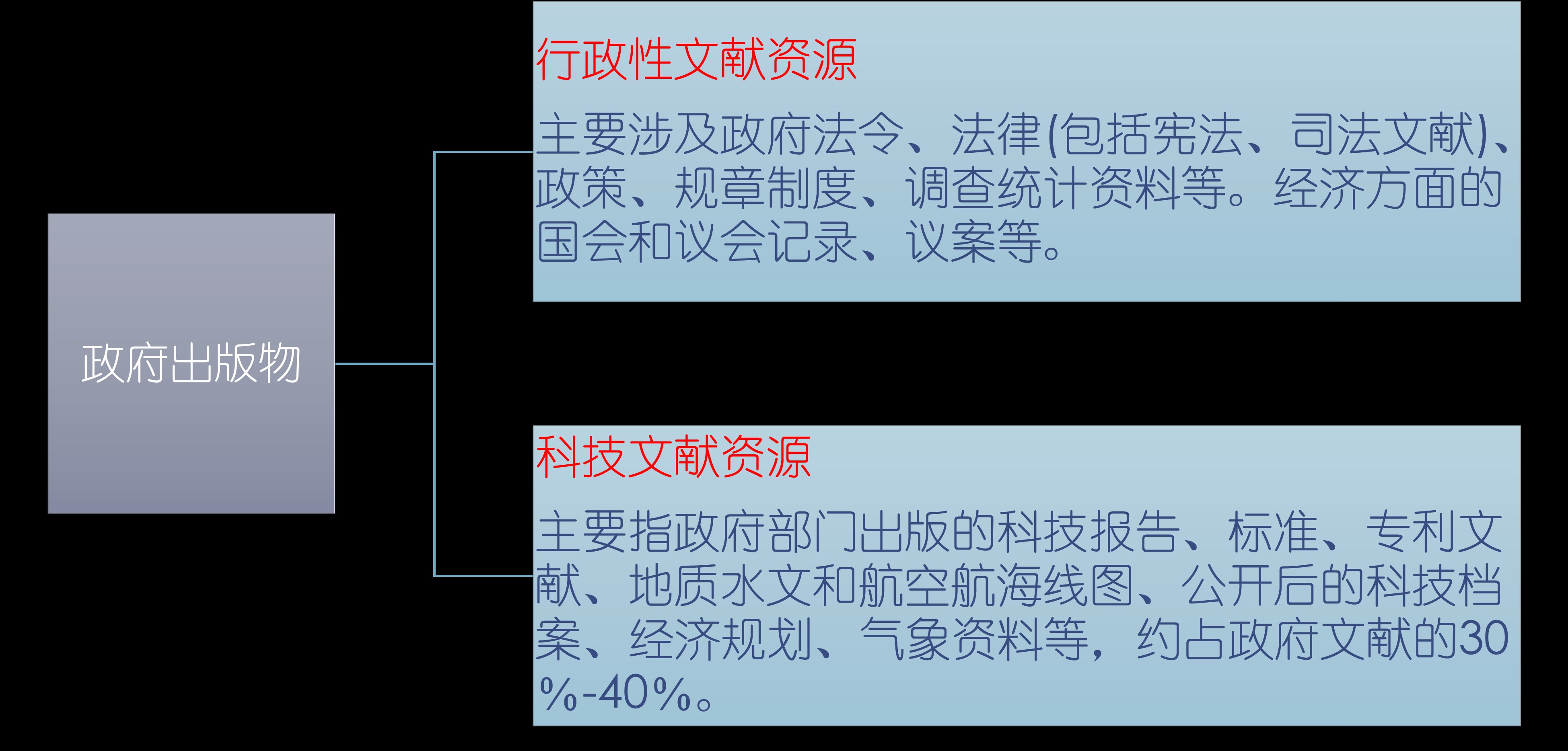 政府出版物又称“官方出版物”。是有官方性质,并由政府部门及其专门机构,根据国家的命令出版的文献资料。其内容比较广泛,大致包括:行政性文献(如法律法规、条约、统计资料等)和科技文献(如研究报告、专利、标准等)两大类。政府出版物是了解各国政治、经济、科学技术等情况的一种重要资料。