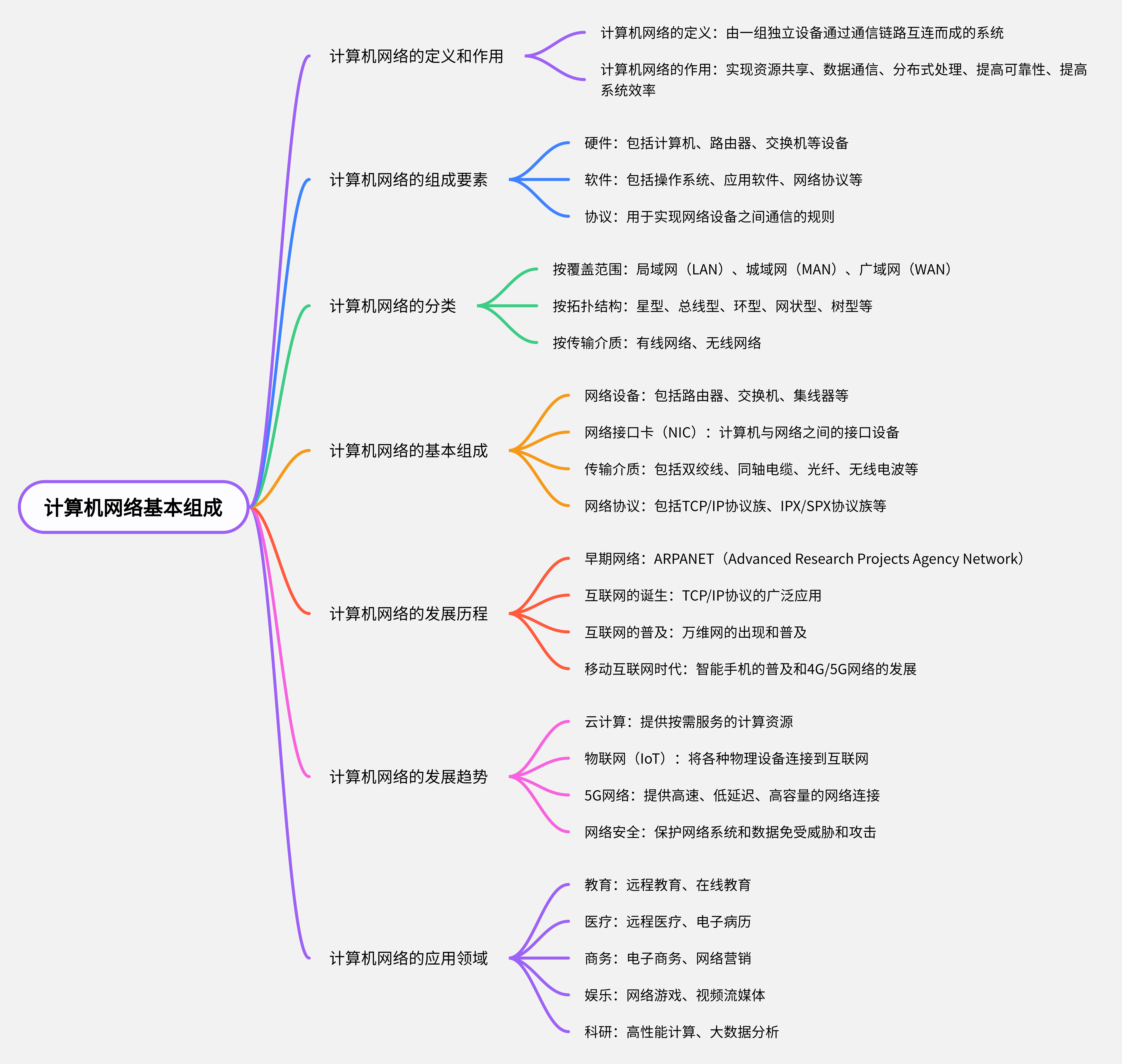 5. 网络管理:网络管理是指对计算机网络进行规划、配置、优化和维护等一系列工作。网络管理包括设备管理、用户管理、流量管理、安全防护等多种方面,以确保网络的正常运行和优化性能。