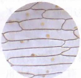 (3)先用低倍镜找一个清楚的细胞移至视野中央,再换高倍镜观察。可见细胞最外面被棕黄色细胞壁所包围,细胞壁以内是着色较浅、近于透明的细胞质。细胞质内有一个或几个或大或小的透明的液泡,在细胞中央或靠近细胞壁,有一细胞核,核内有染色成棕黄色的核仁(见实验图1-2)。细胞质外围有一薄层细胞质膜,在生活细胞中不易分清。