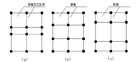 民用建筑柱网和层高根据建筑使用功能确定。目前,住宅、宾馆和办公楼柱网可划分为小柱网和大柱网两类。小柱网指一个开间为一个柱距(图4-2b),柱距一般为3.3m、3.6m、4.0m等;大柱网指两个开间为一个柱距(图4-2c),柱距通常为6.0m、6.6m、7.2m、7.5等。常用的跨度(房屋进深)为4.8m、5.4m、6.0m、6.6m、7.2m、7.5m等。