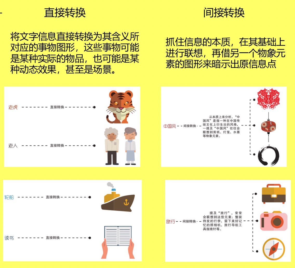 1.直接转换:将文字信息直接转换为其含义所对应的事物图形,这些事物可能是某种实际的物品,也可能是某种动态效果,甚至是场景。
