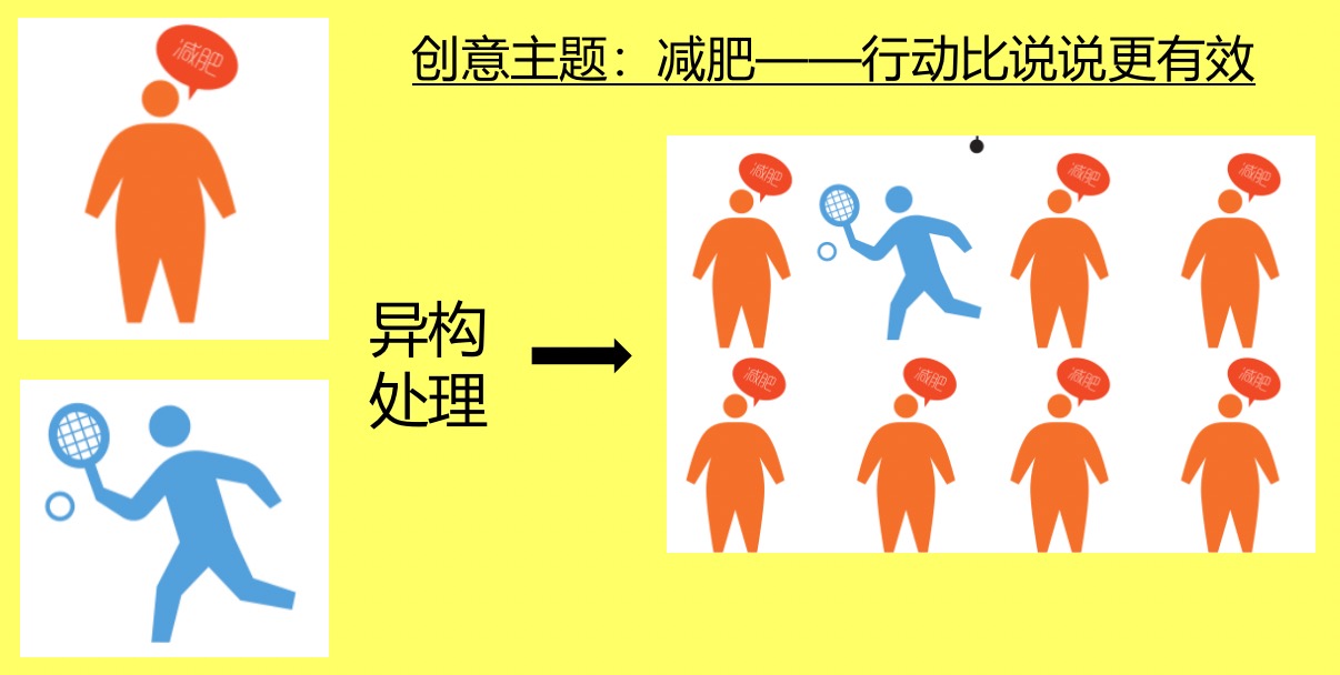 ②异构图形:在一组完全相同或大致相同的图形组中,添加少量与其余图形完全不同的图形元素,达到突变的效果。一个或多个存在着某种潜在联系的图形元素组合起来,构建出一个怪诞且荒谬的形象。