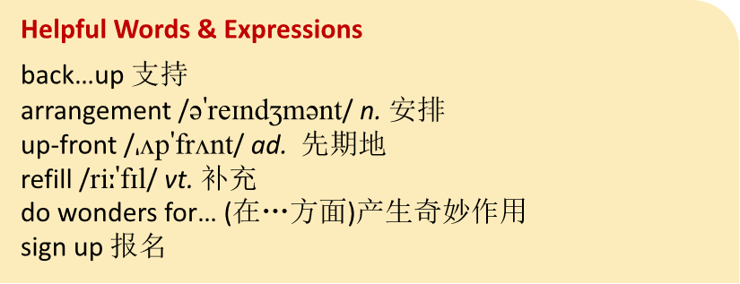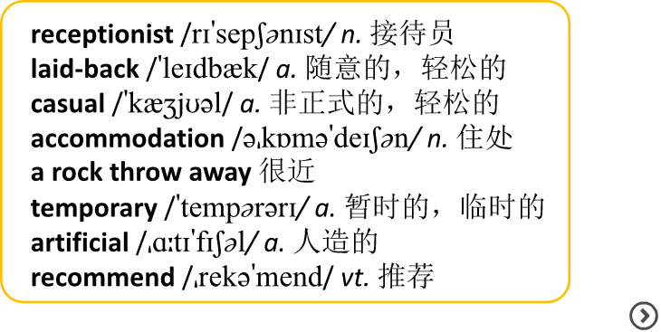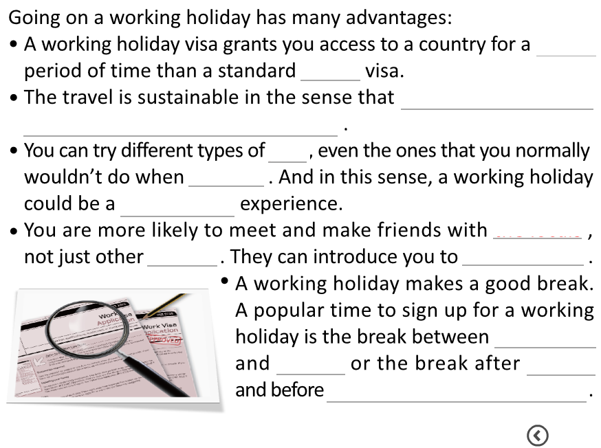 You are going to hear a talk about a working holiday. Listen to it twice and complete the following summary according to what you have heard. Compare your answers with your partner. Before you start, getting to know the following new words and expressions might be helpful.