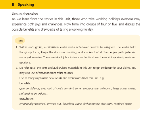 As we learn from the stories in this unit, those who take working holidays overseas may experience both joys and challenges. Now form into groups of four or five, and discuss the possible benefits and drawbacks of taking a working holiday.