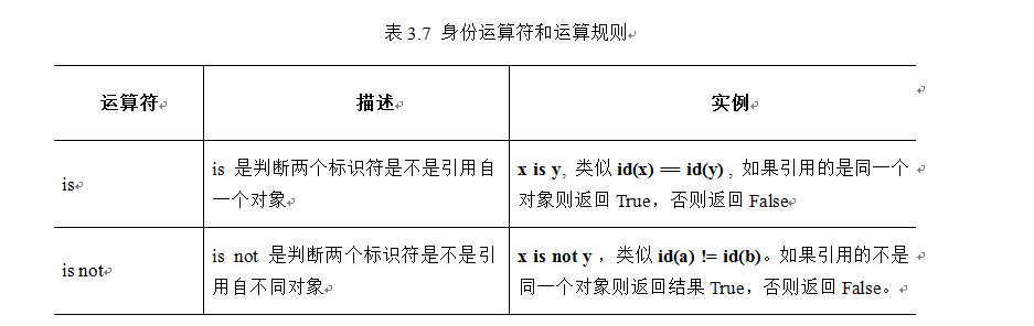 身份运算符用于比较两个对象的存储单元。下例中id() 函数用于获取对象的内存地址。