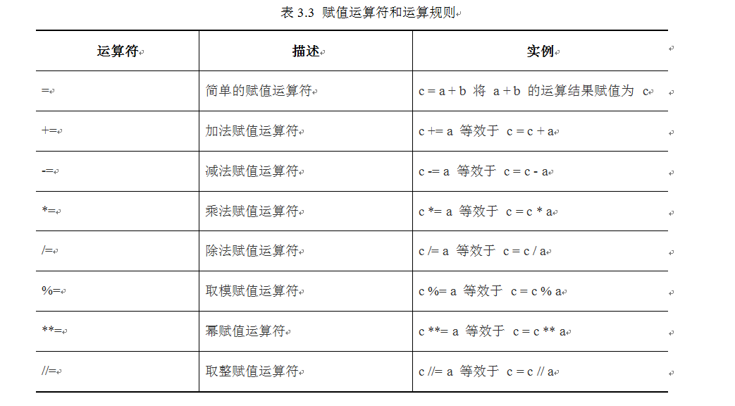 Python中的赋值运算符用来给对象赋值,运算规则如表3.3所示: