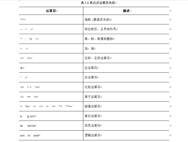 运算符与参与运算的对象一起构成了Python的表达式,表达式的运算要遵循运算符的优先级。表3.8列出了所有运算符从最高到最低的优先级。