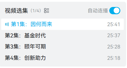 《基金》共4集,每集25分钟,用丰富、生动的影像语言,讲述了我国基金行业的起步、制度体系的搭建和信义义务的根基,展示了基金投资研究体系的专业运作方式,呈现了基金行业在塑造健康财富文化、发挥普惠金融功能、服务国家战略等方面的积极作用。